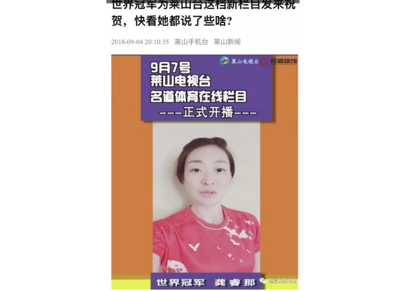 2018年9月7日,瑞信科技產(chǎn)業(yè)下的名道羽毛球館攜手萊山電視臺(tái),推出新欄目《名道體育在線》。播出當(dāng)日,龔睿那發(fā)來祝賀,祝賀名道體育在線順利開播,同時(shí)也祝賀名道球館和萊山電視臺(tái)越辦越好。
